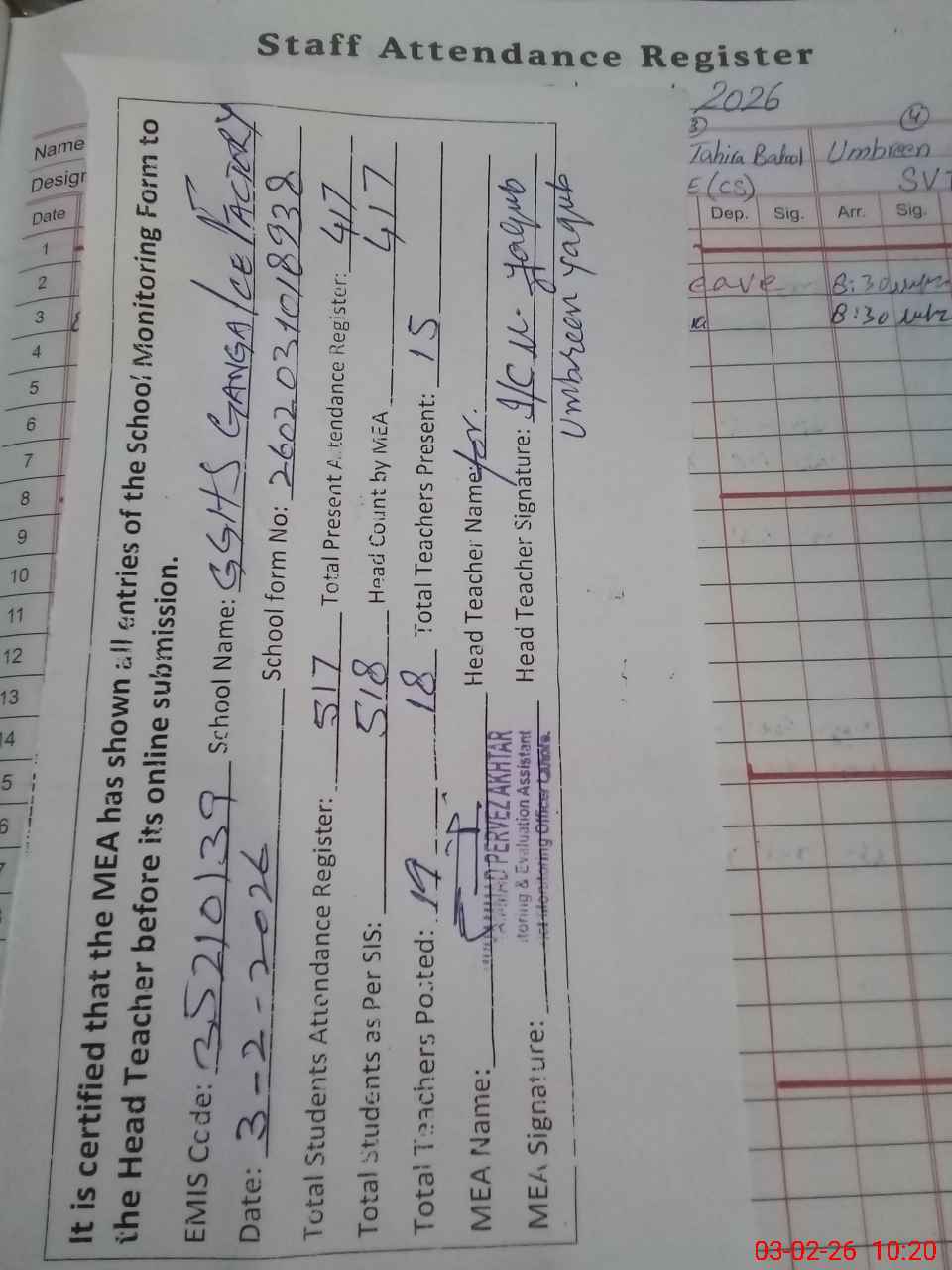 | Attendance Register | Head Teacher | MEA with School | Visit Proof |