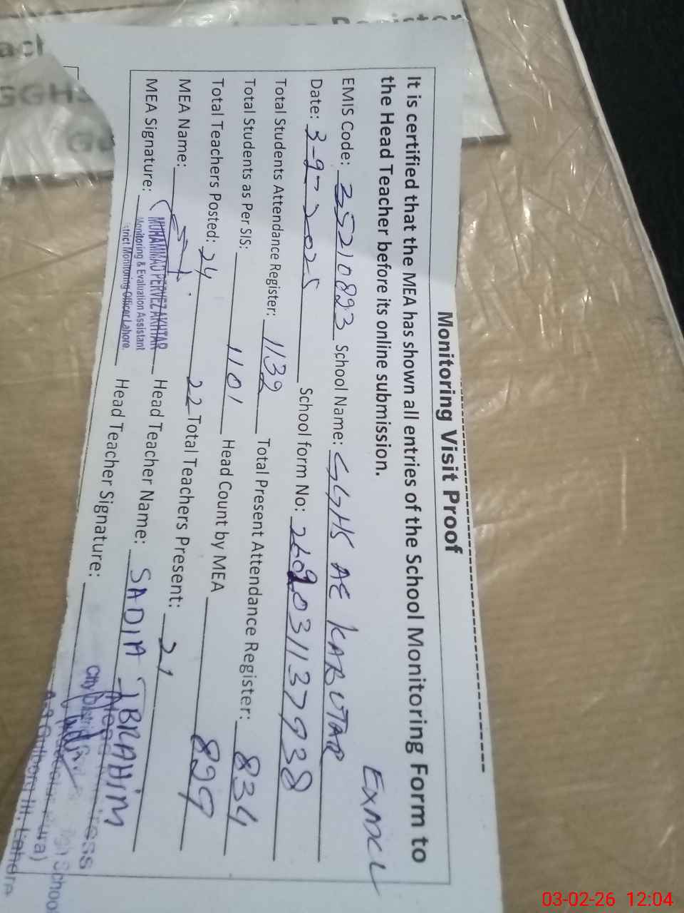 | EMIS Code: 35210823 | Name of School: GGHS A/3 KABUTAR PURA GULBERG III (EX-MCL) | |||