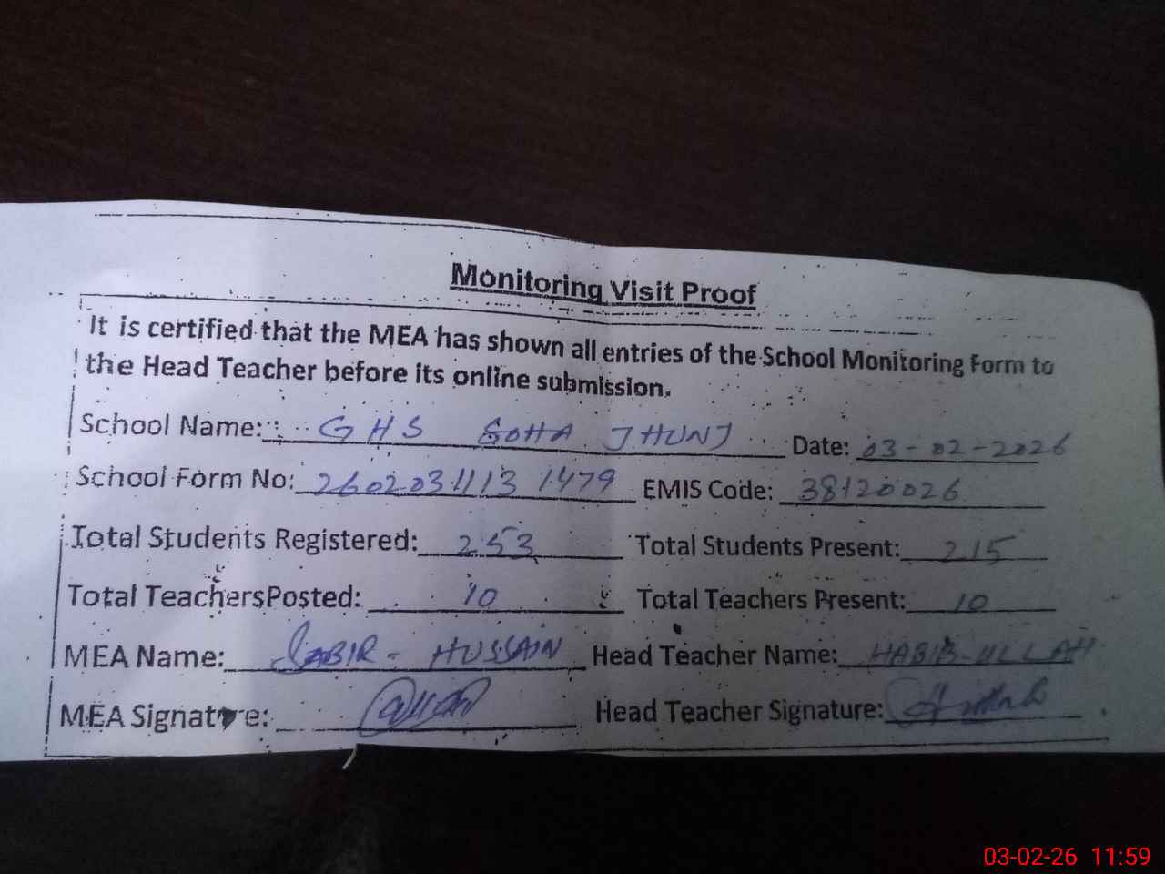 | EMIS Code: 38120026 | Name of School: GHS SOHA JHUNJ | |||