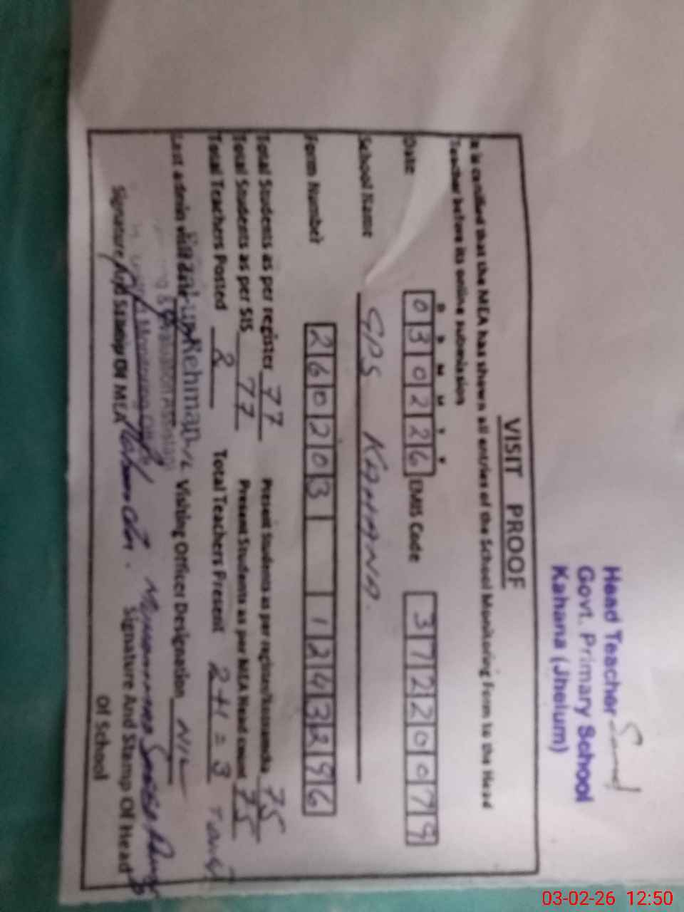 | Attendance Register | Head Teacher | MEA with School | Visit Proof |