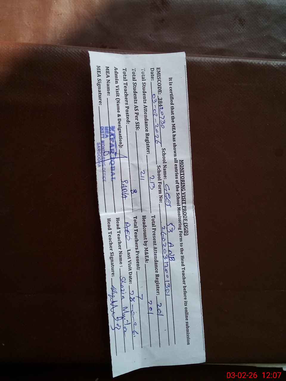 | Attendance Register | Head Teacher | MEA with School | Visit Proof |