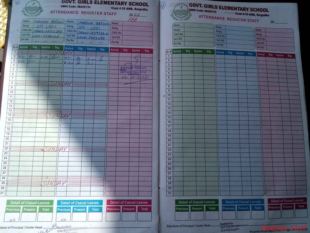 | CNIC | Full Name | Designation | R/C | Absence During Last Calender Month |