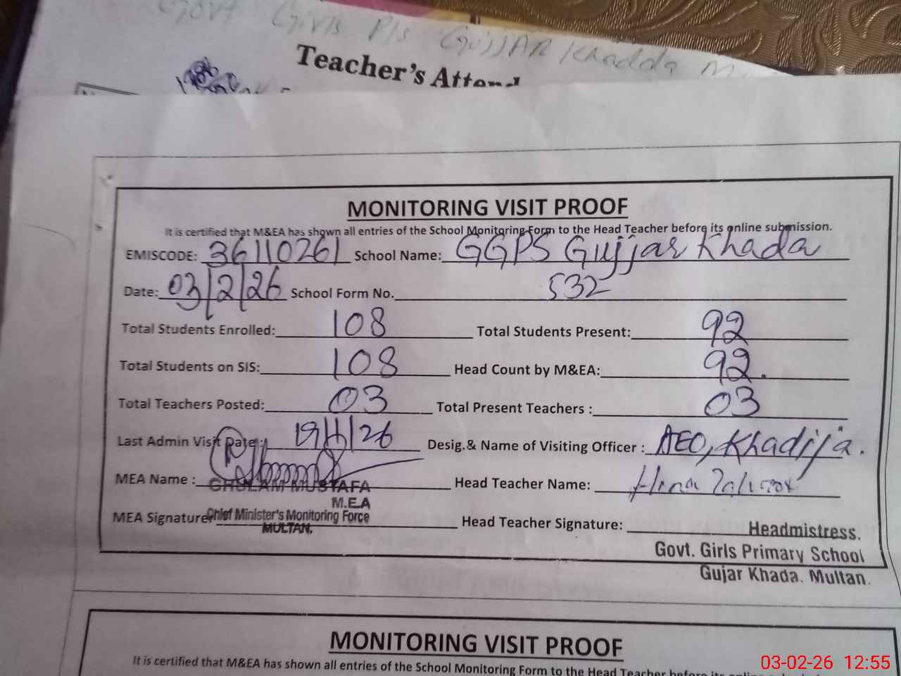 | Attendance Register | Head Teacher | MEA with School | Visit Proof |