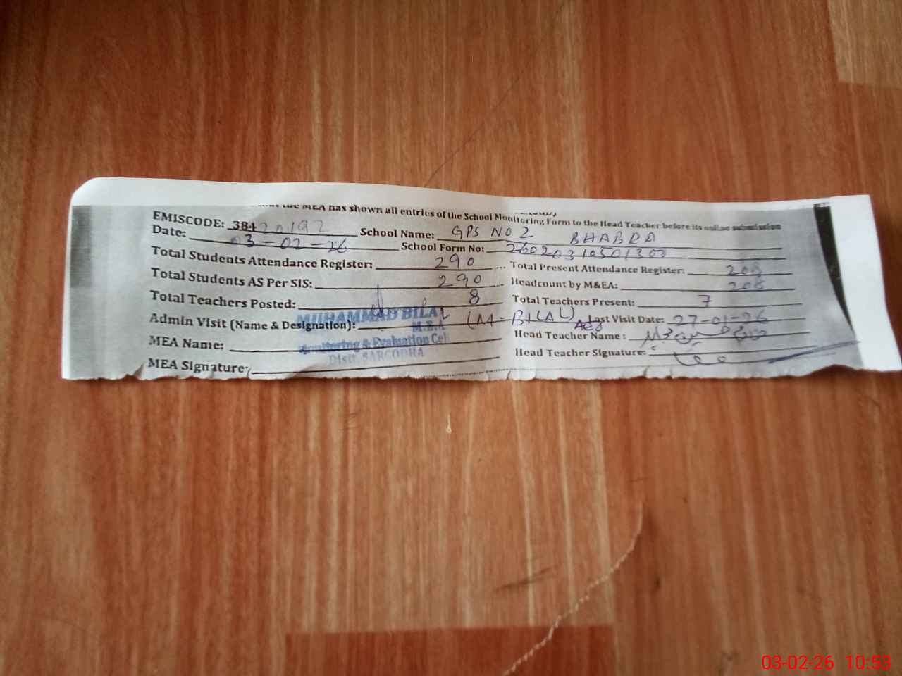 | Attendance Register | Head Teacher | MEA with School | Visit Proof |