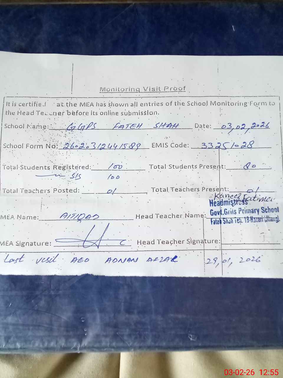 | Attendance Register | Head Teacher | MEA with School | Visit Proof |