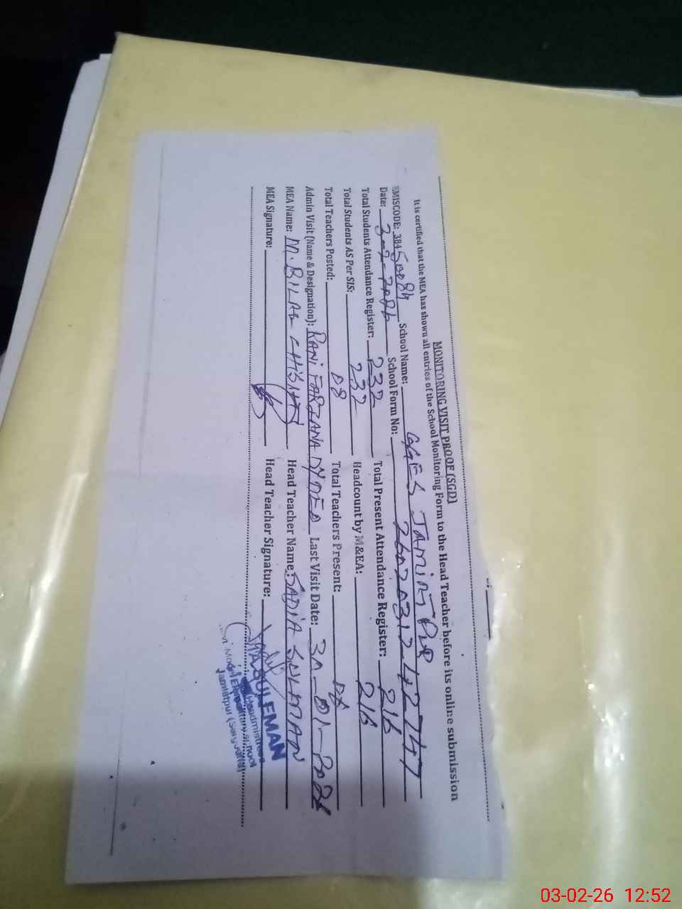| Attendance Register | Head Teacher | MEA with School | Visit Proof |