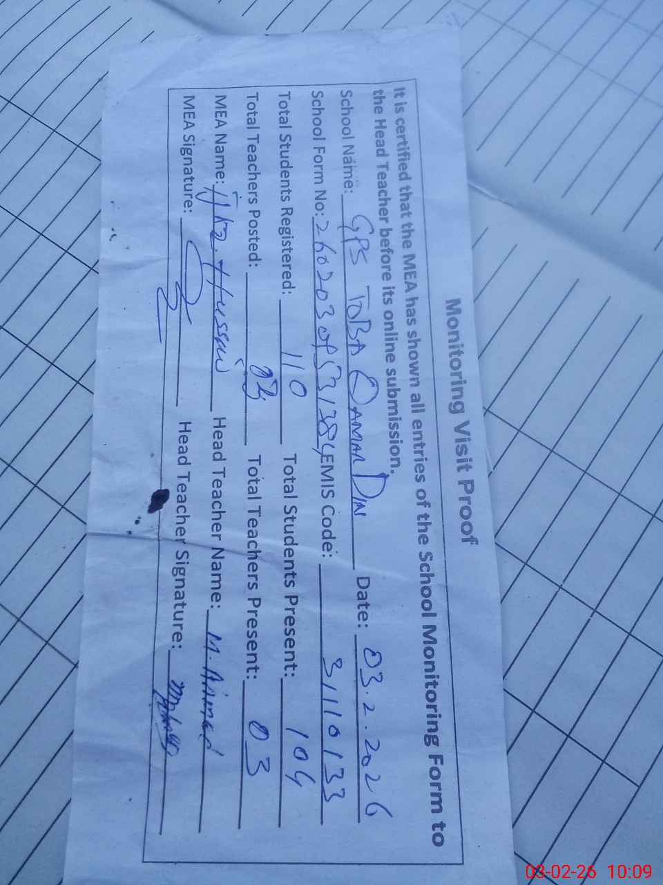 | Attendance Register | Head Teacher | MEA with School | Visit Proof |