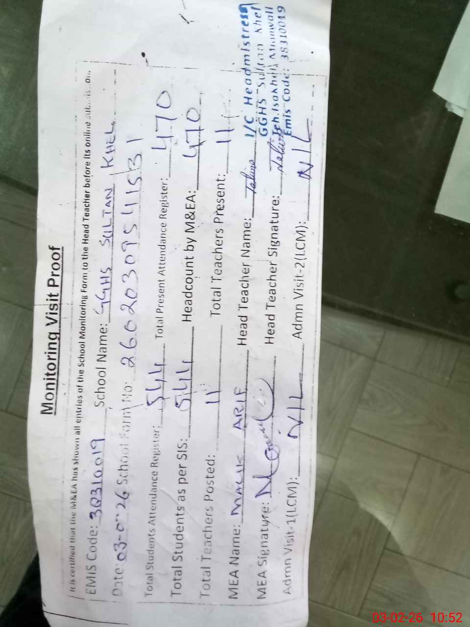 | EMIS Code: 38310019 | Name of School: GGHS SULTAN KHEL | |||