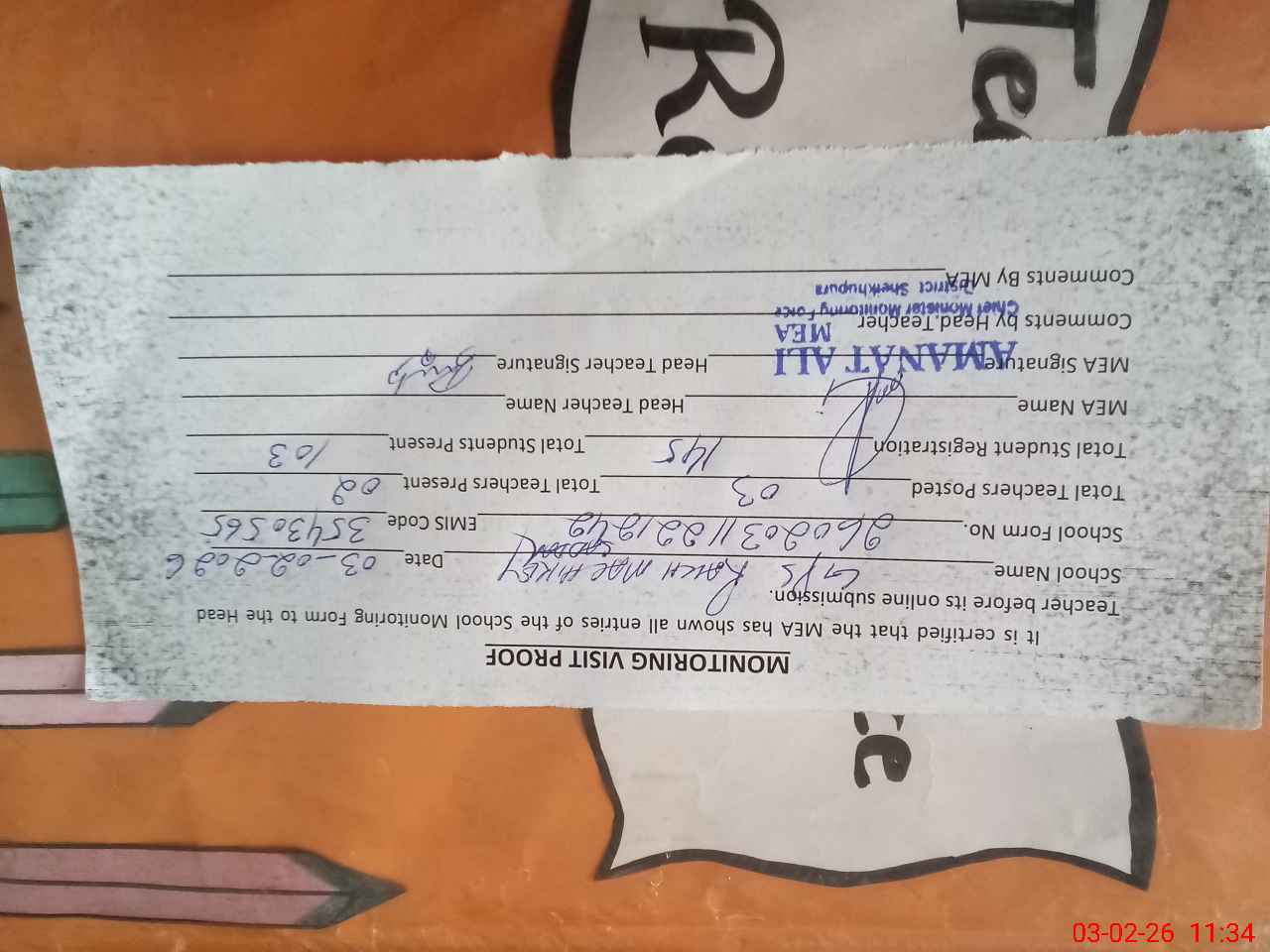 | Attendance Register | Head Teacher | MEA with School | Visit Proof |