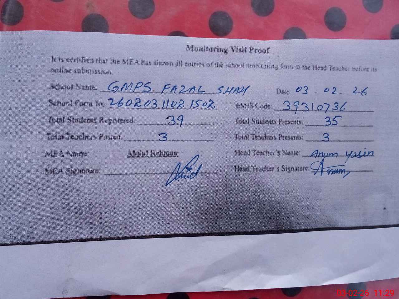 | Attendance Register | Head Teacher | MEA with School | Visit Proof |