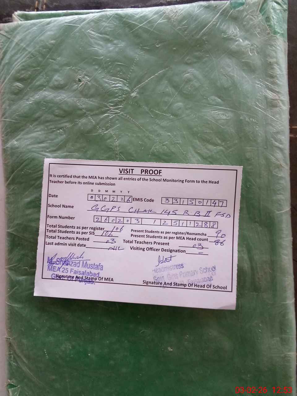 | Attendance Register | Head Teacher | MEA with School | Visit Proof |