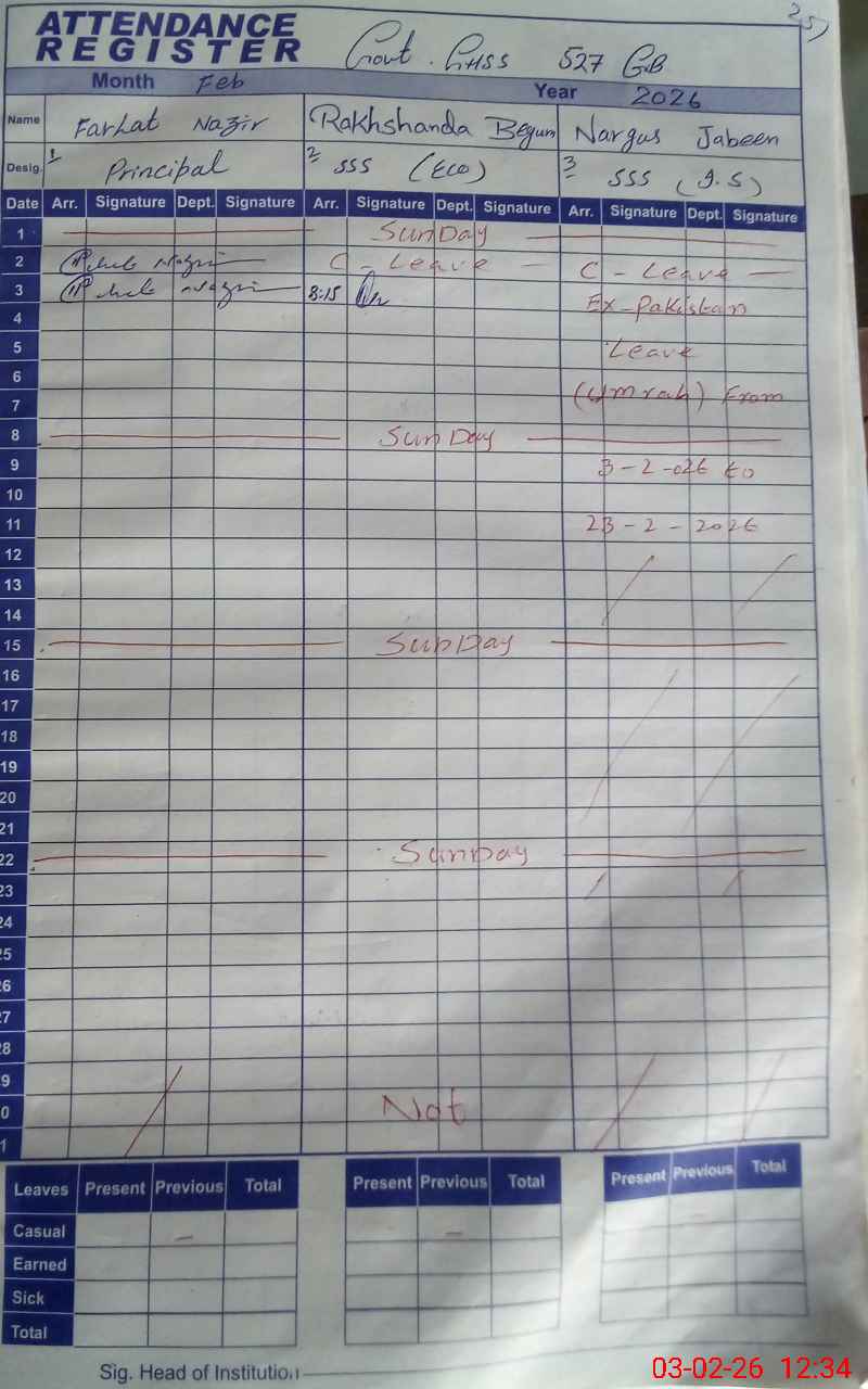 | Remarks (Use Separate Page if Required): SSE SALMA ANJUM UNAUTHORISED ABSENT SINCE 01 FEBRUARY 2025 POOR DISCIPLINE OF SCHOOL DURING VISIT FREQUENTLY MOVEMENT OF STUDENTS FROM HIGH CLASSES 9th AND 10th TO HIGHER SECONDARY CLASSES 1st AND 2nd YEAR FOR HEAD COUNTING IS OBSERVED AND ALSO ACKNOWLEDGED BY SCHOOL PRINCIPAL | |||||