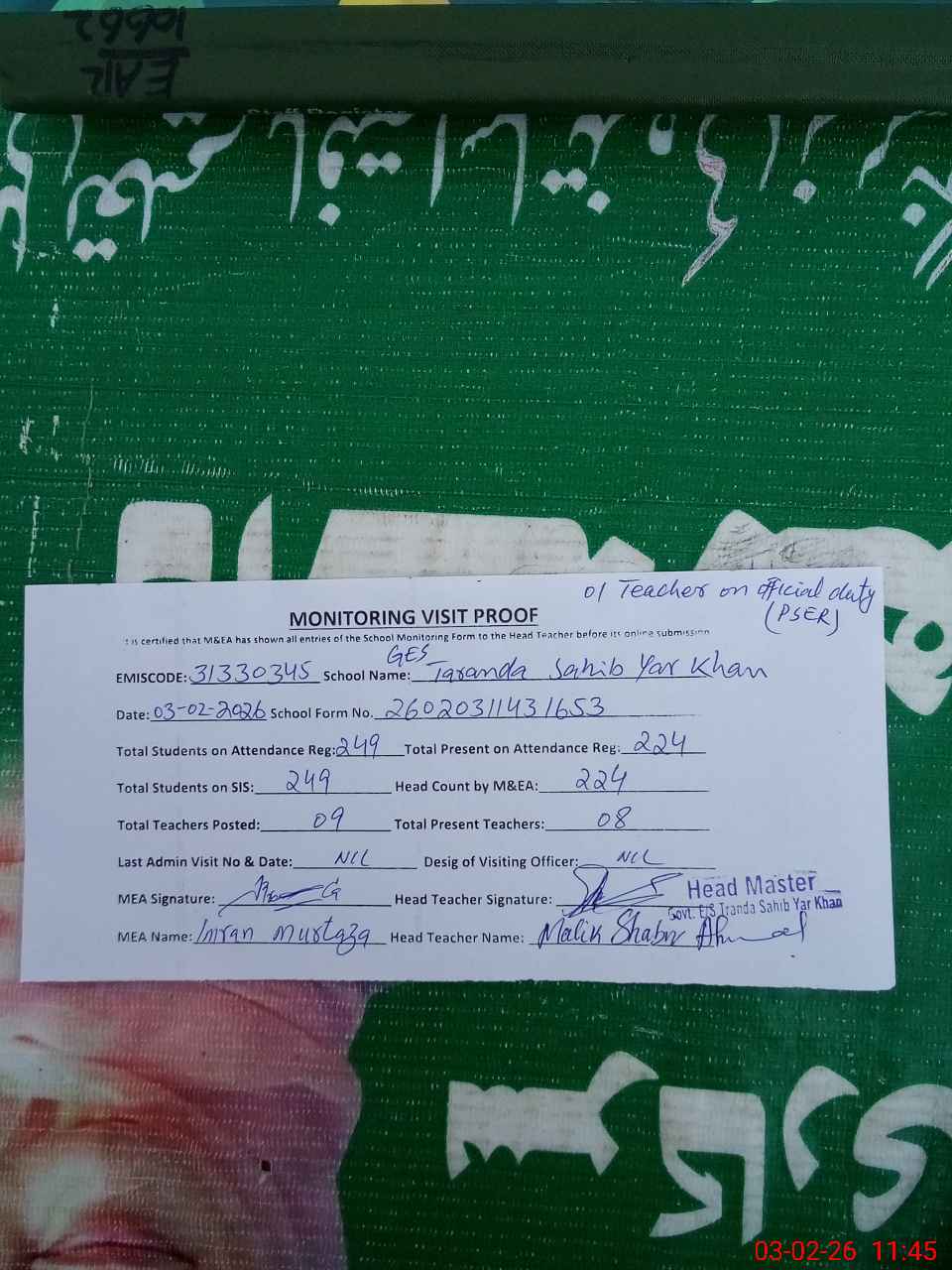 | Attendance Register | Head Teacher | MEA with School | Visit Proof |
