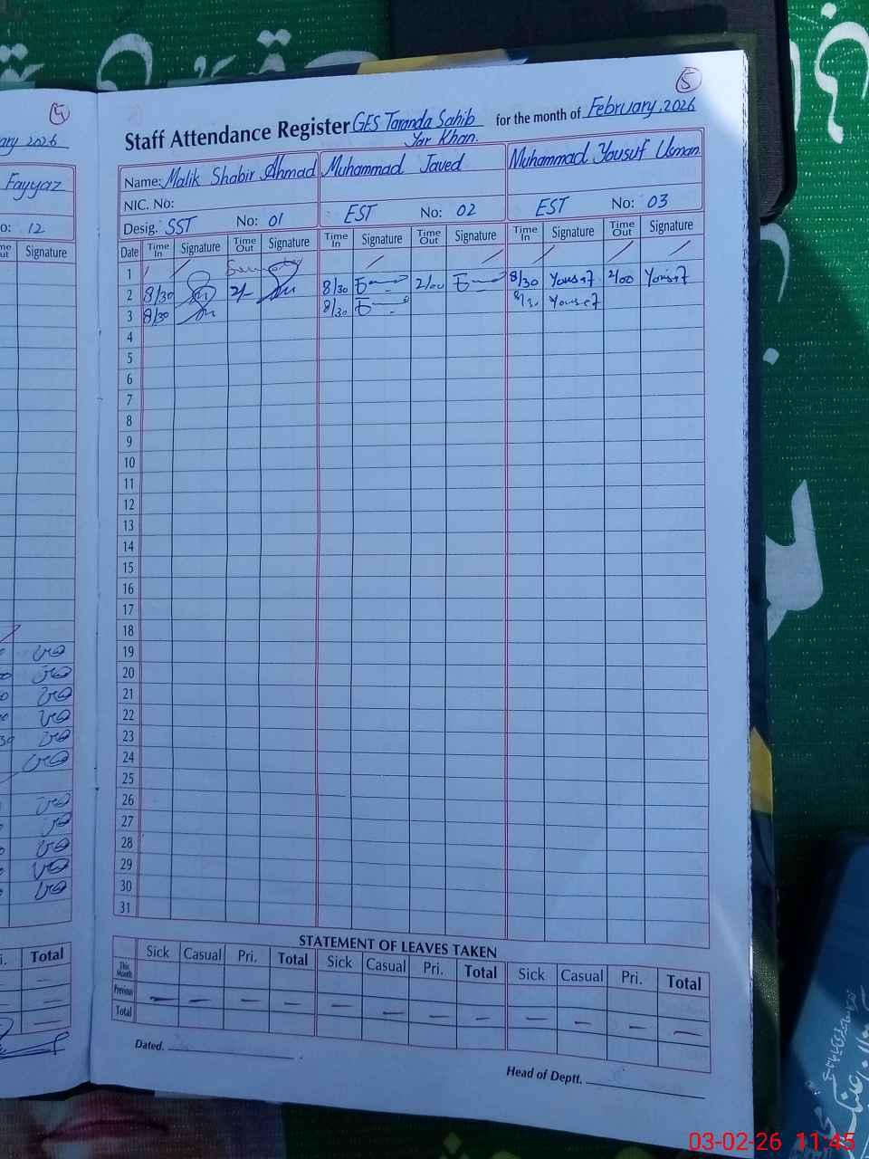 | CNIC | Full Name | Designation | R/C | Absence During Last Calender Month |