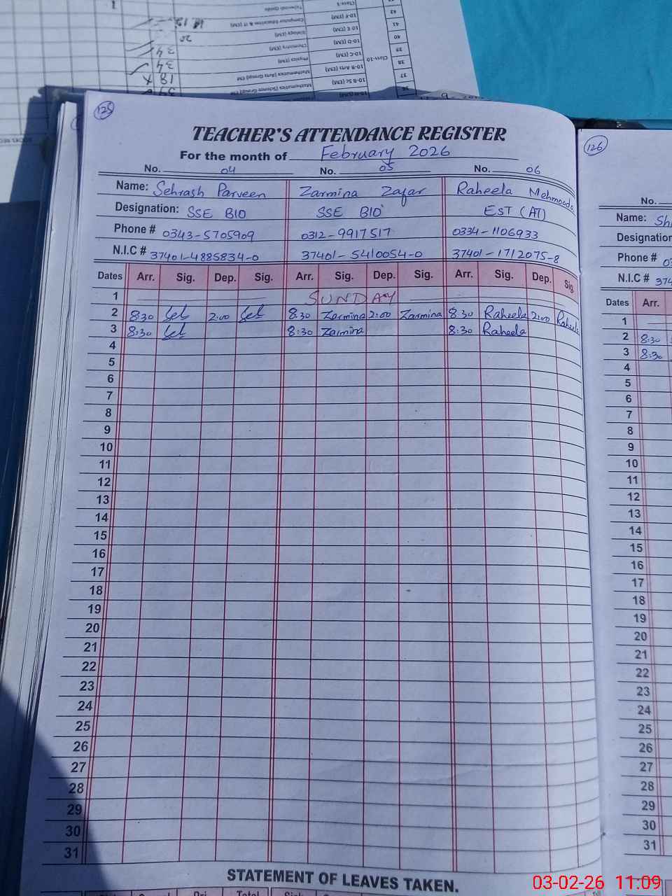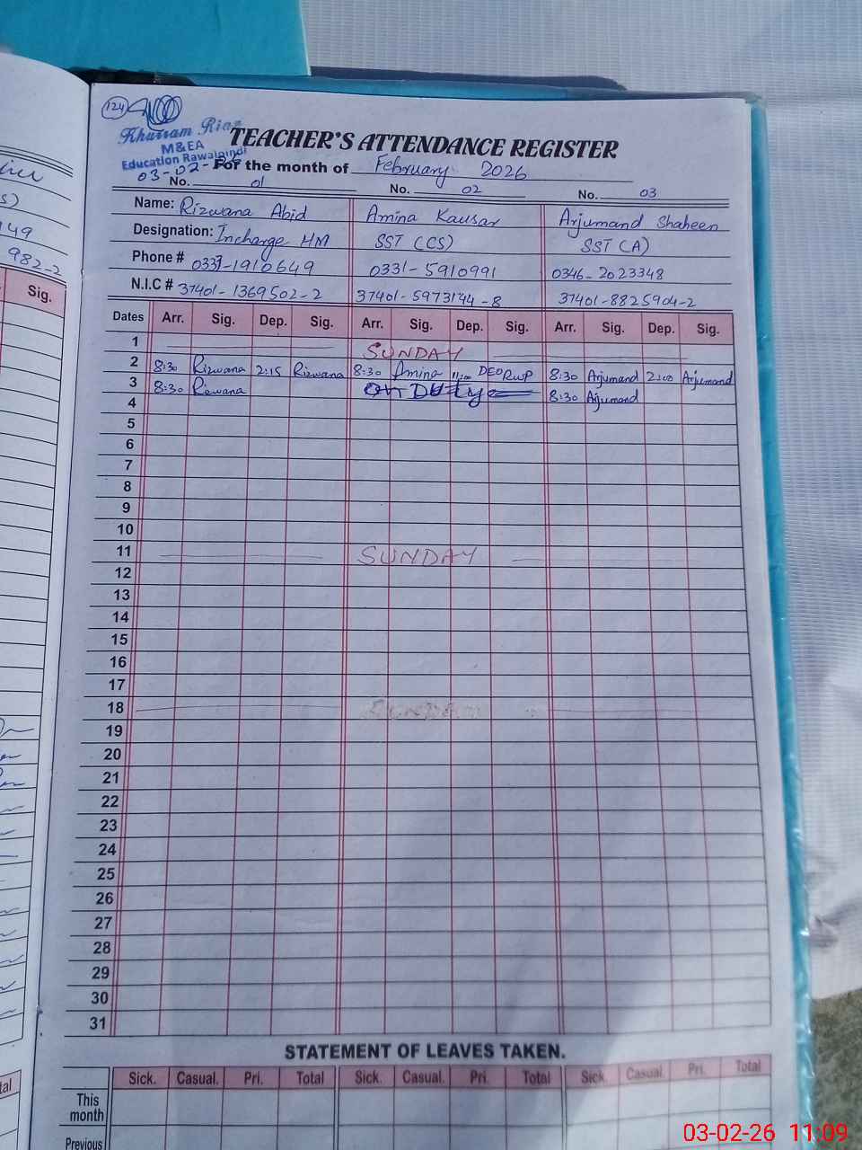| CNIC | Full Name | Designation | R/C | Absence During Last Calender Month |