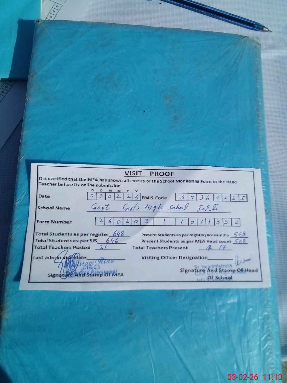 | Attendance Register | Head Teacher | MEA with School | Visit Proof |