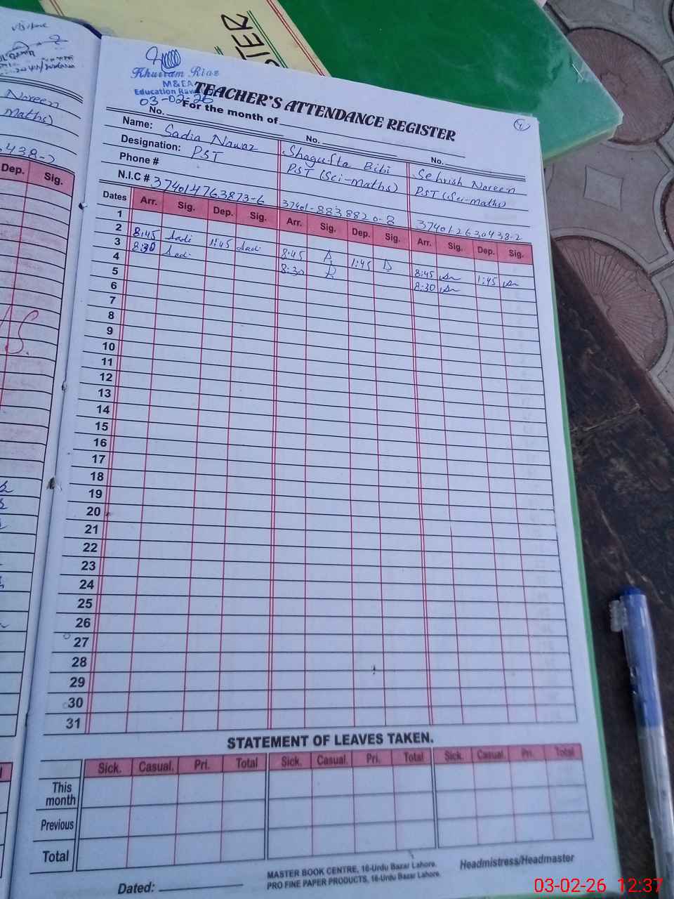 | CNIC | Full Name | Designation | R/C | Absence During Last Calender Month |