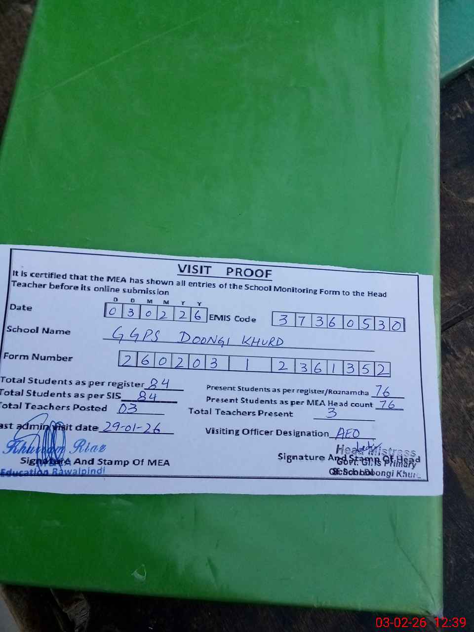 | Certified that this School was Inspected by the Undersigned MEA/DMO Today and the Information Stated Above is as Per Record. | |||||