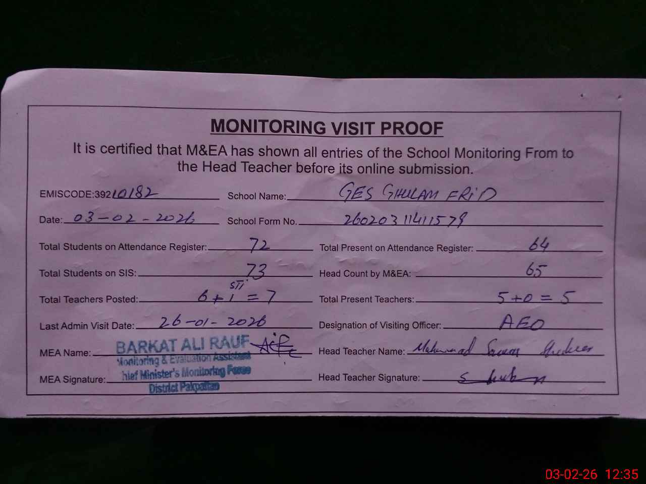 | EMIS Code: 39210182 | Name of School: GES BASTI GHULAM FARID | |||