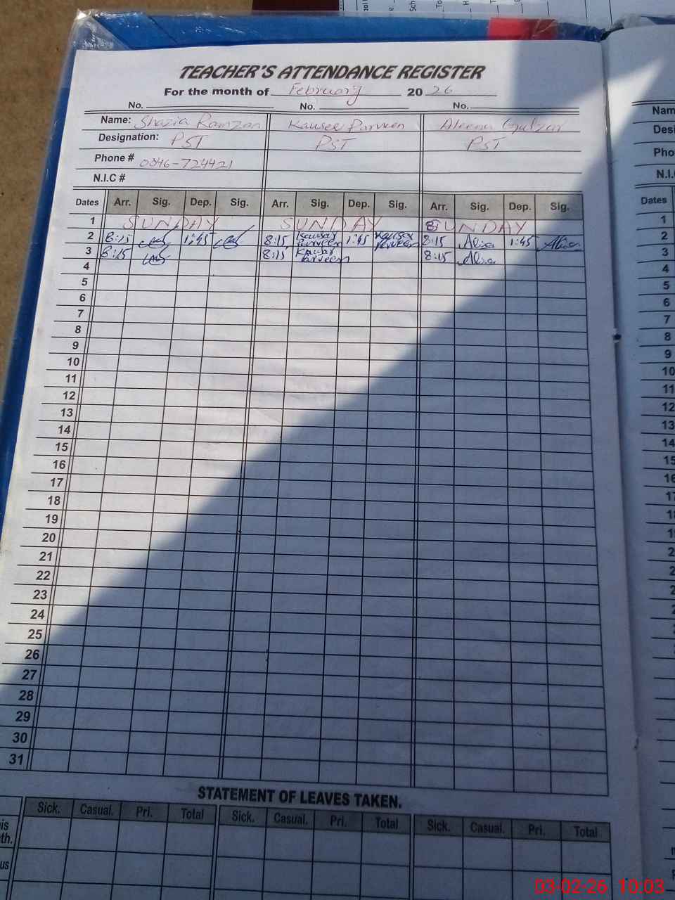 | Name: Sh**** Ra**** Designation: (School Headmaster's/Headmistress's) PST Phone/Cell Number: 03**** |