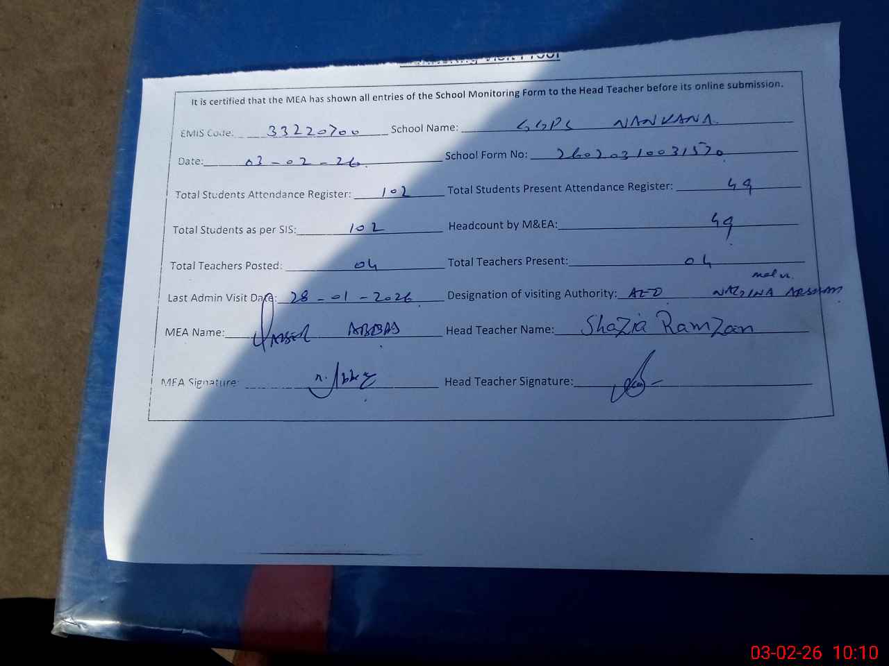 | Attendance Register | Head Teacher | MEA with School | Visit Proof |