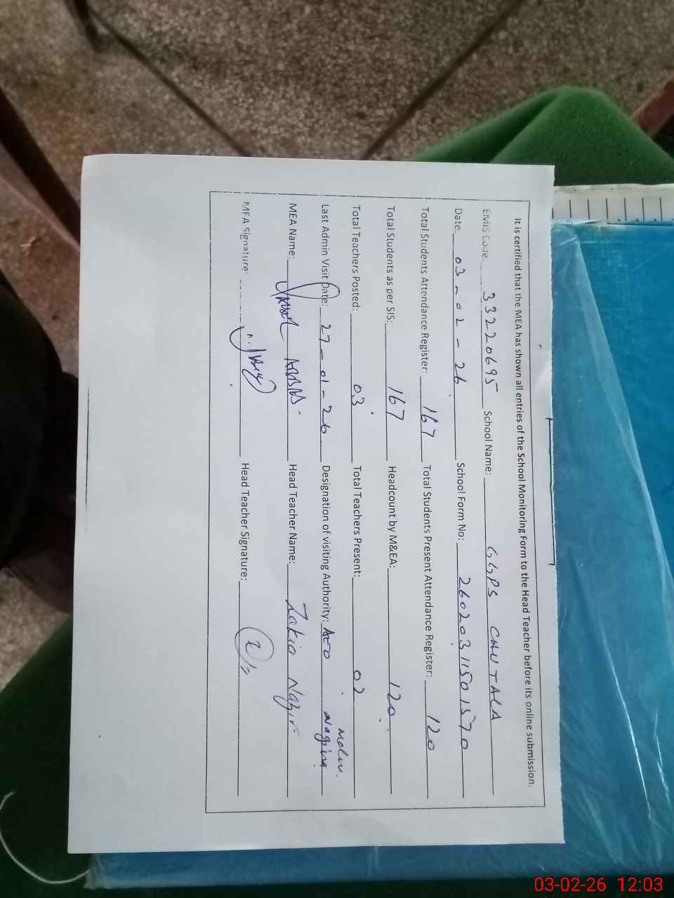 | Attendance Register | Head Teacher | MEA with School | Visit Proof |