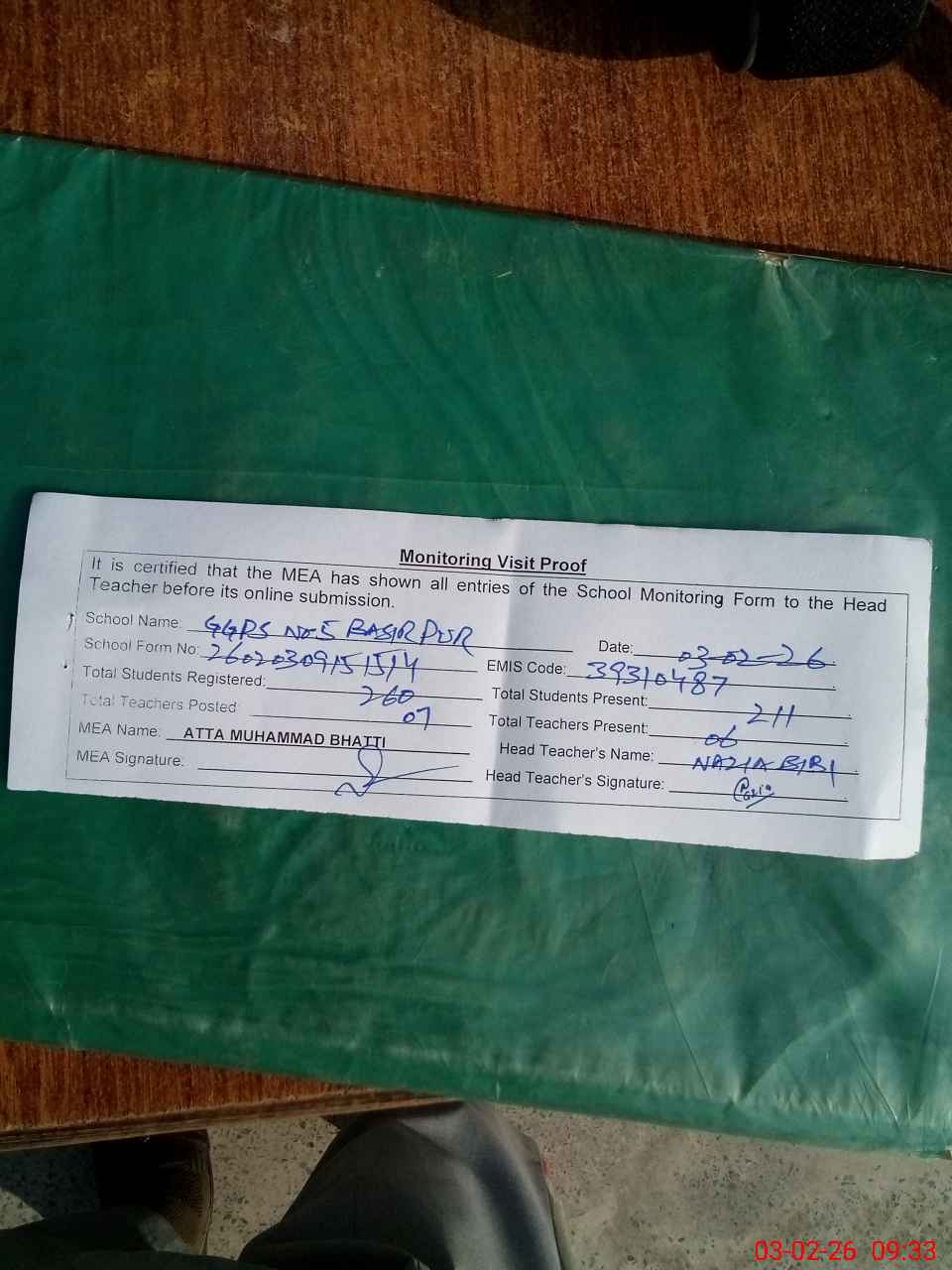 | EMIS Code: 39310487 | Name of School: GGPS NO. 5 BASIR PUR | |||