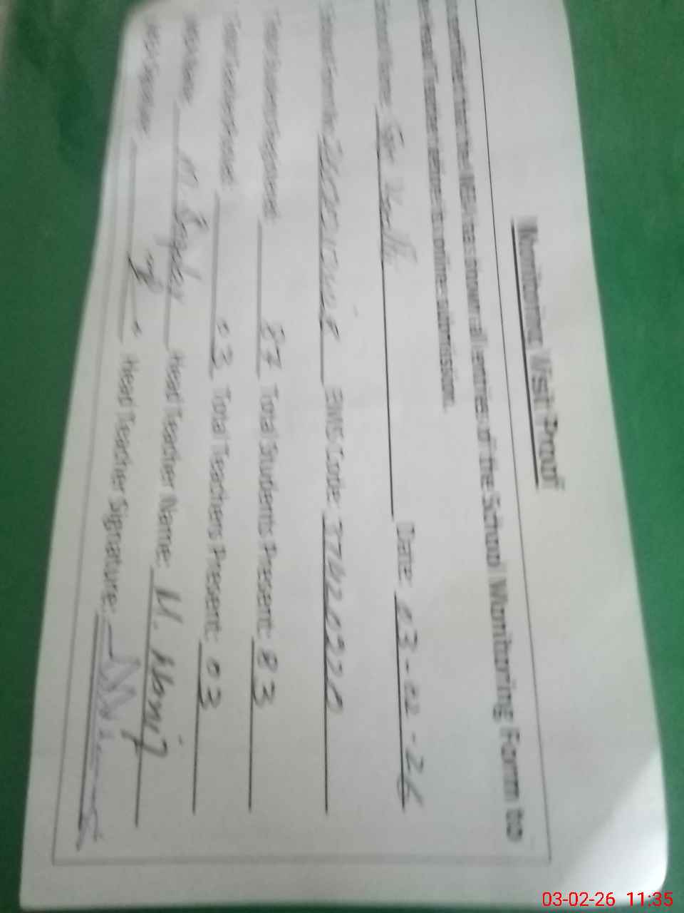 | Attendance Register | Head Teacher | MEA with School | Visit Proof |