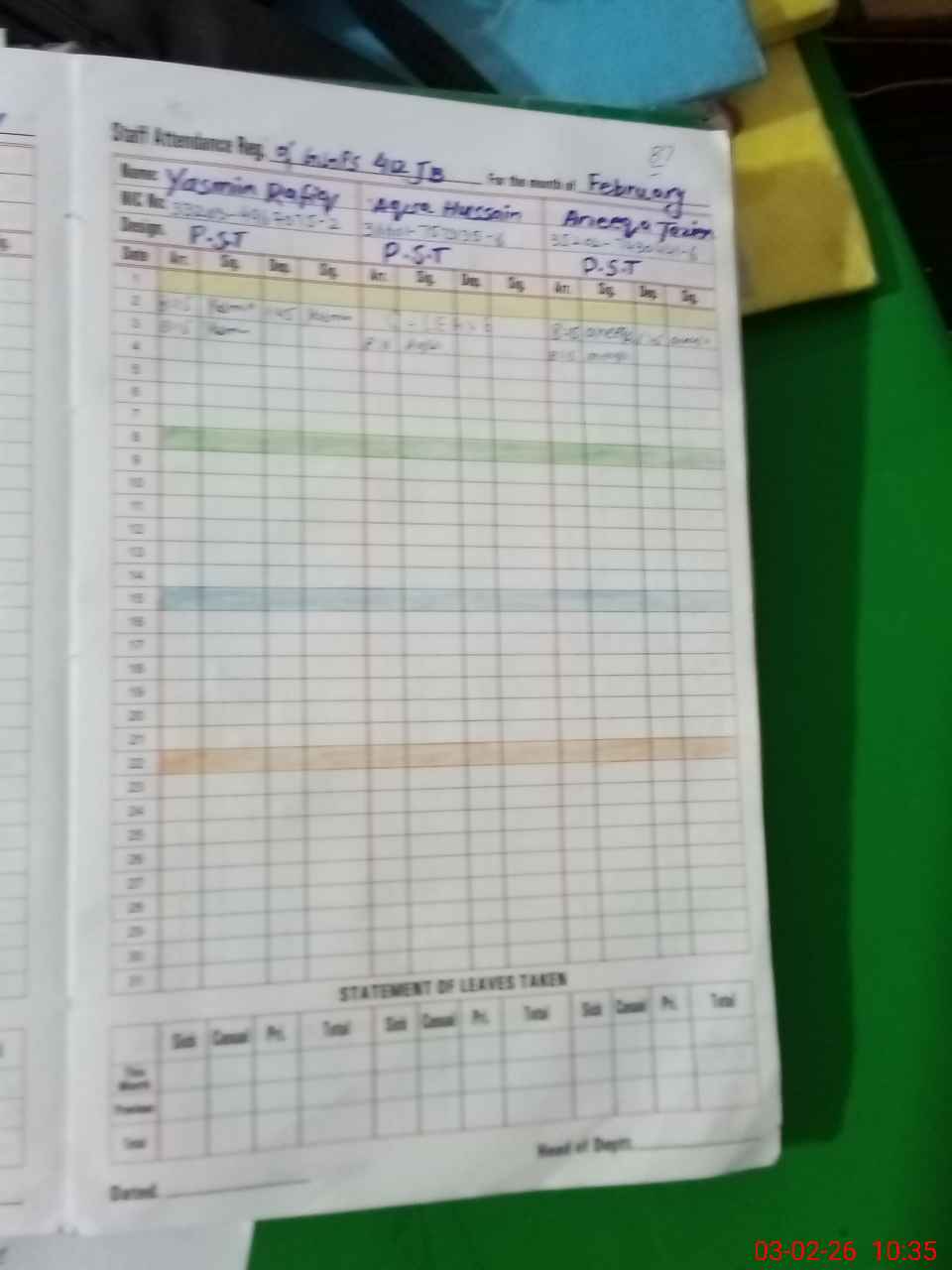 | CNIC | Full Name | Designation | R/C | Absence During Last Calender Month |