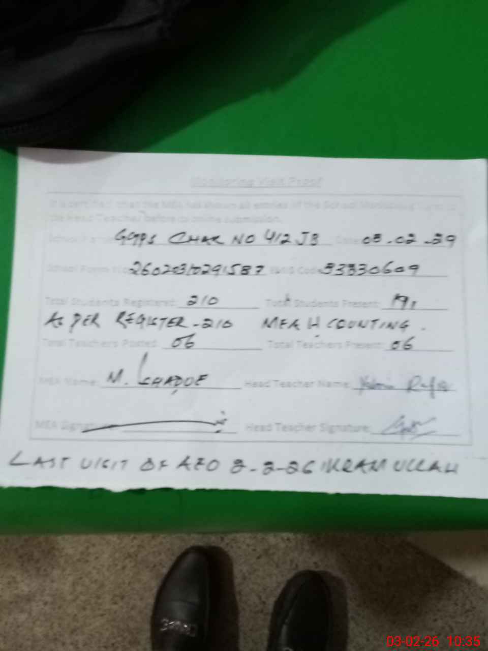 | Attendance Register | Head Teacher | MEA with School | Visit Proof |
