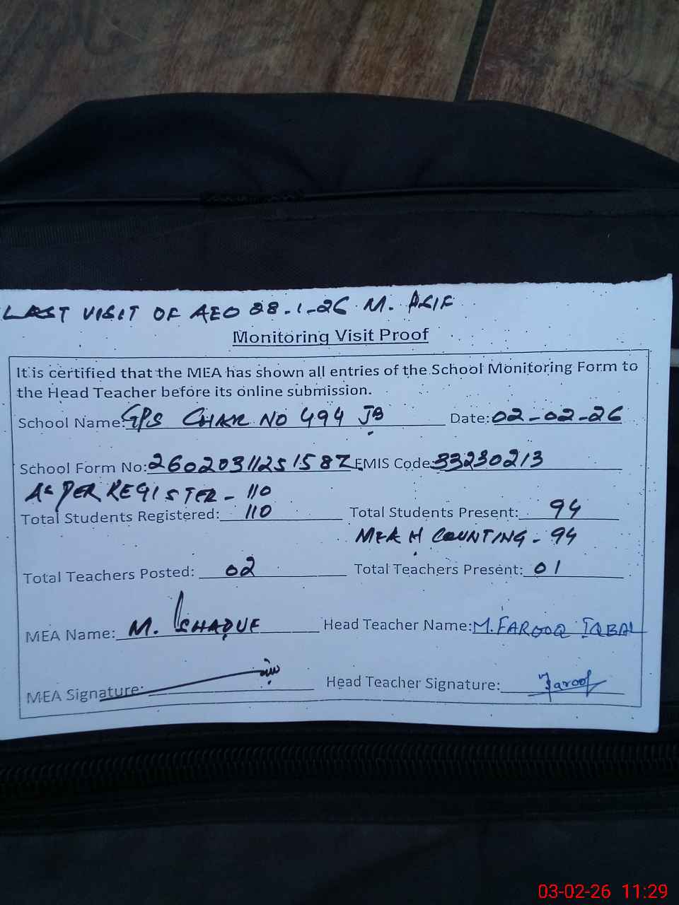| EMIS Code: 33230213 | Name of School: GPS CHAK NO 494 JB | |||