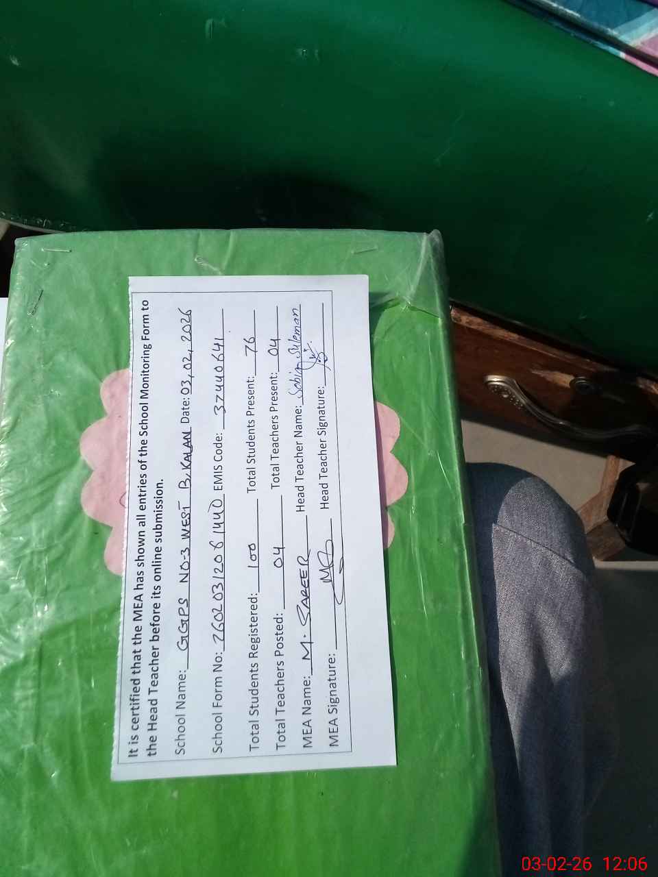 | Attendance Register | Head Teacher | MEA with School | Visit Proof |