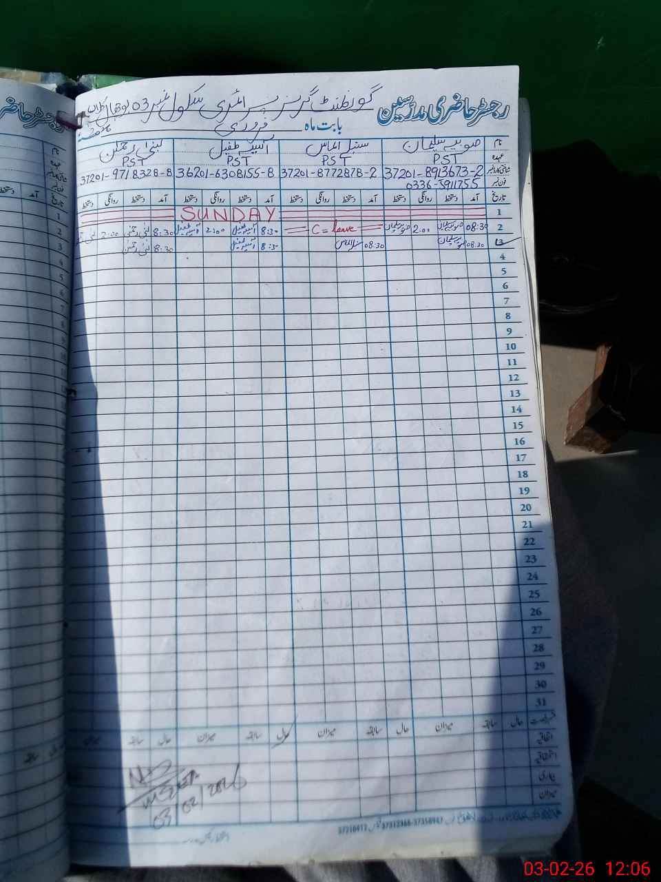 | CNIC | Full Name | Designation | R/C | Absence During Last Calender Month |