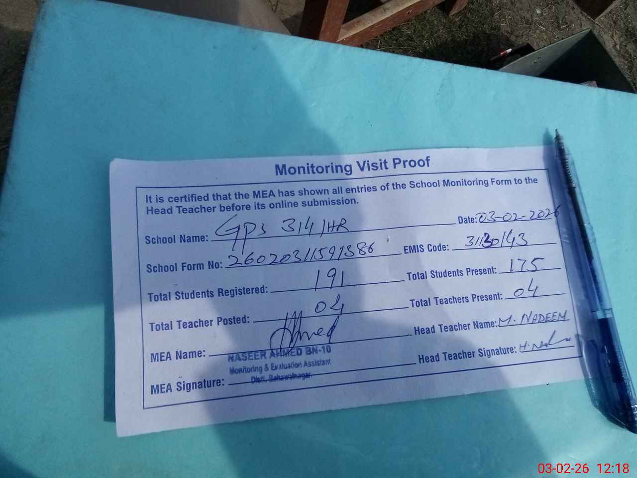 | EMIS Code: 31130143 | Name of School: GPS CHAK 314/HR | |||