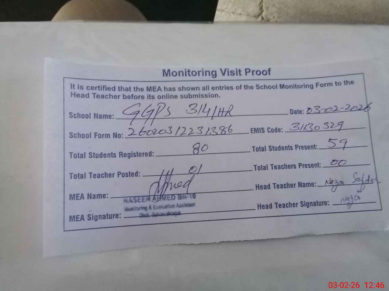 | Attendance Register | Head Teacher | MEA with School | Visit Proof |