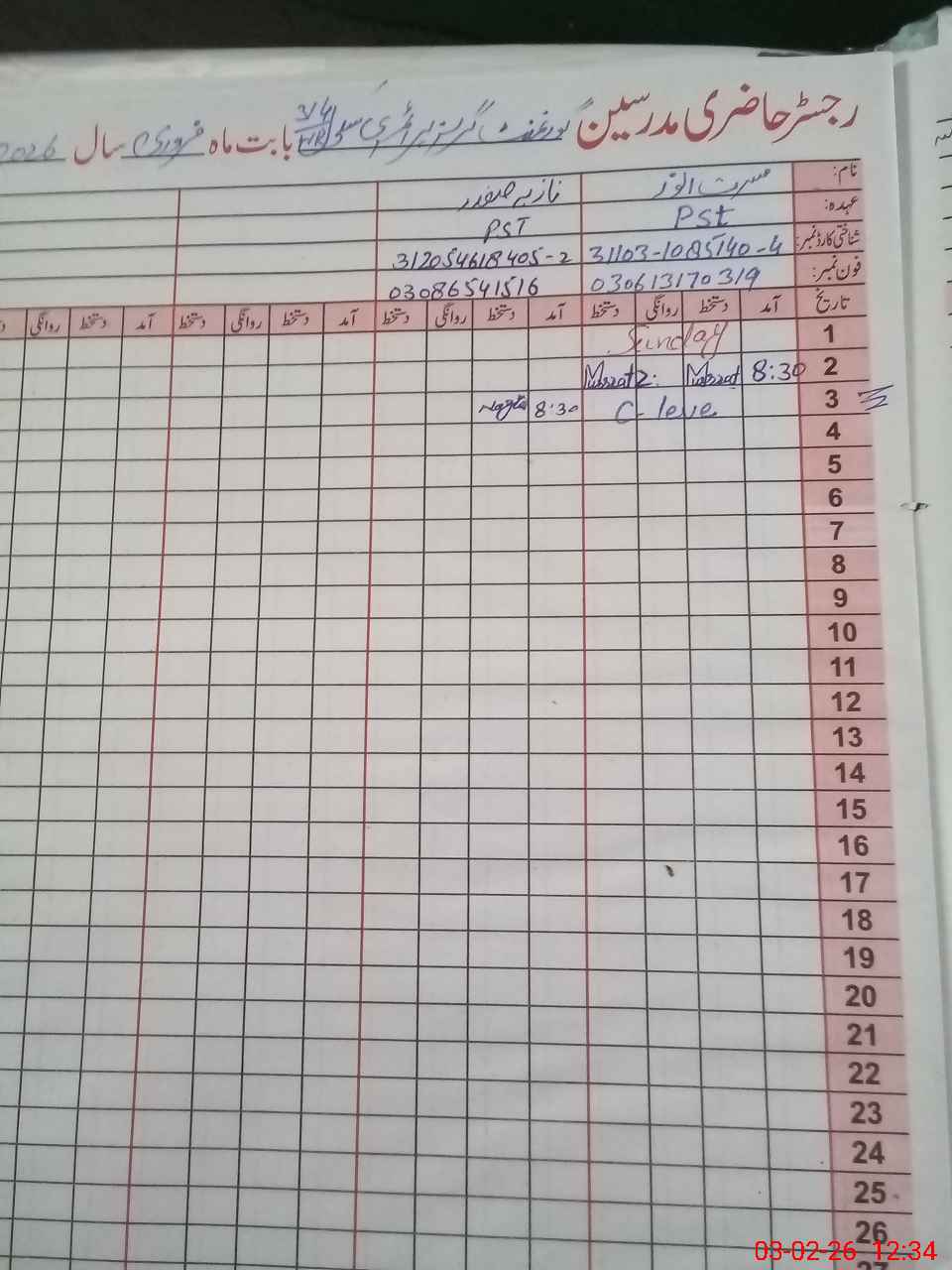 | CNIC | Full Name | Designation | R/C | Absence During Last Calender Month |