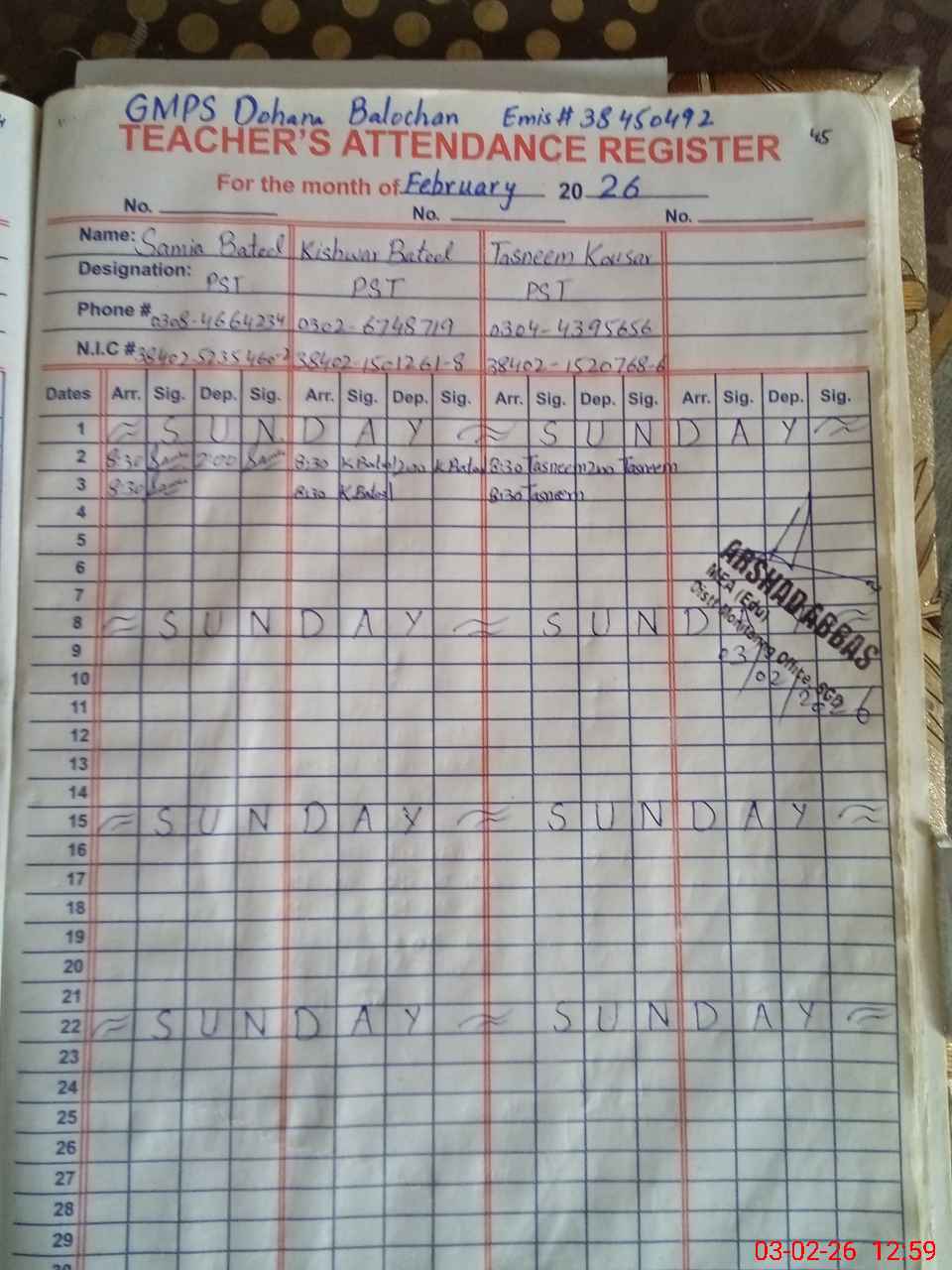 | Name: SA**** BA**** Designation: (School Headmaster's/Headmistress's) PST Phone/Cell Number: 03**** |