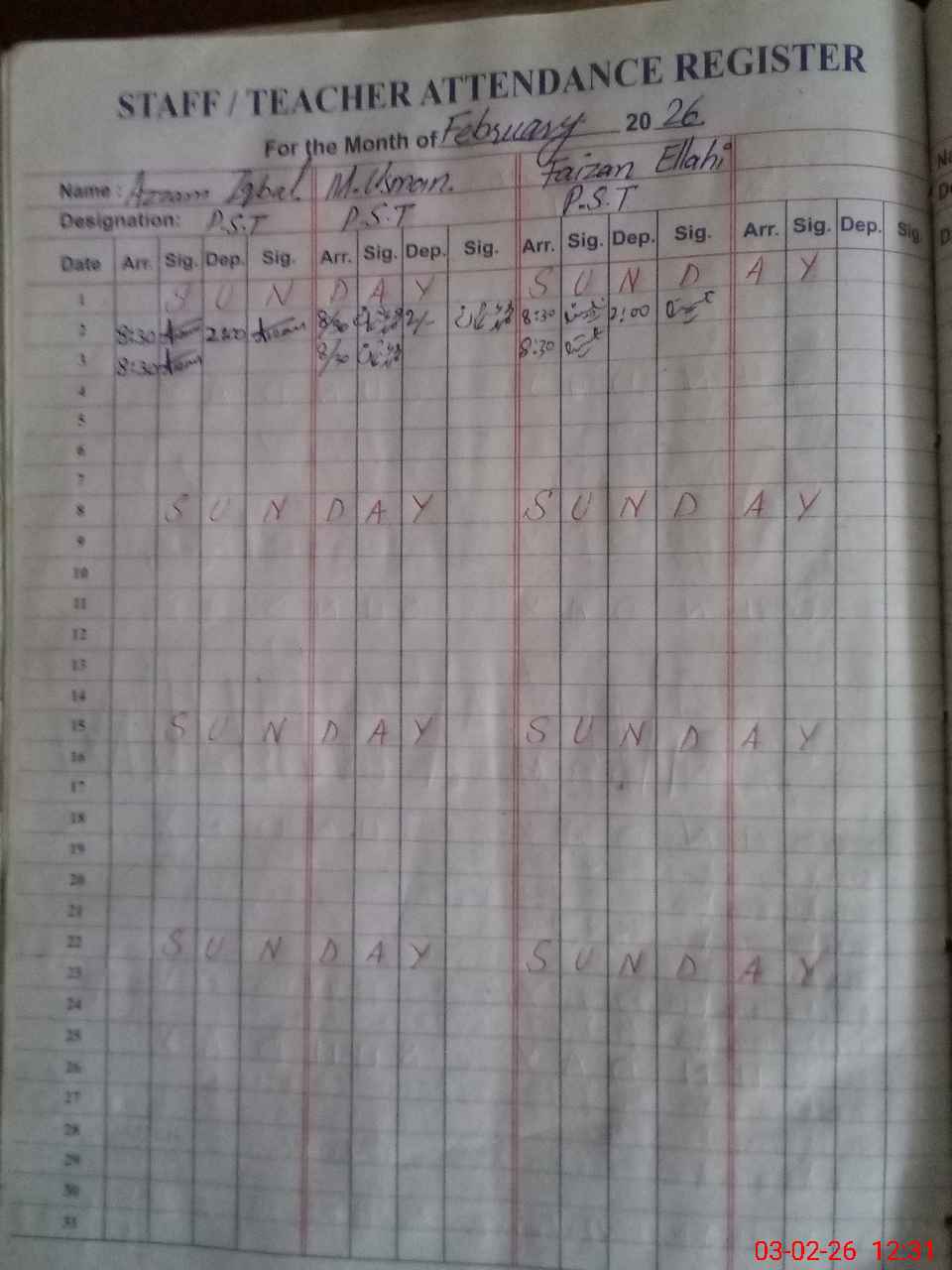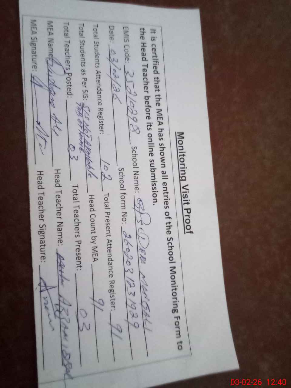 | Remarks (Use Separate Page if Required): Administrator visit of the AEO on 20th and 29th January 2026 Administrator visit of the Dy DEO in the school in 2025 to till today not available . According to the head statement the school school tab at home.due to that students not checked on the sis. | |||||