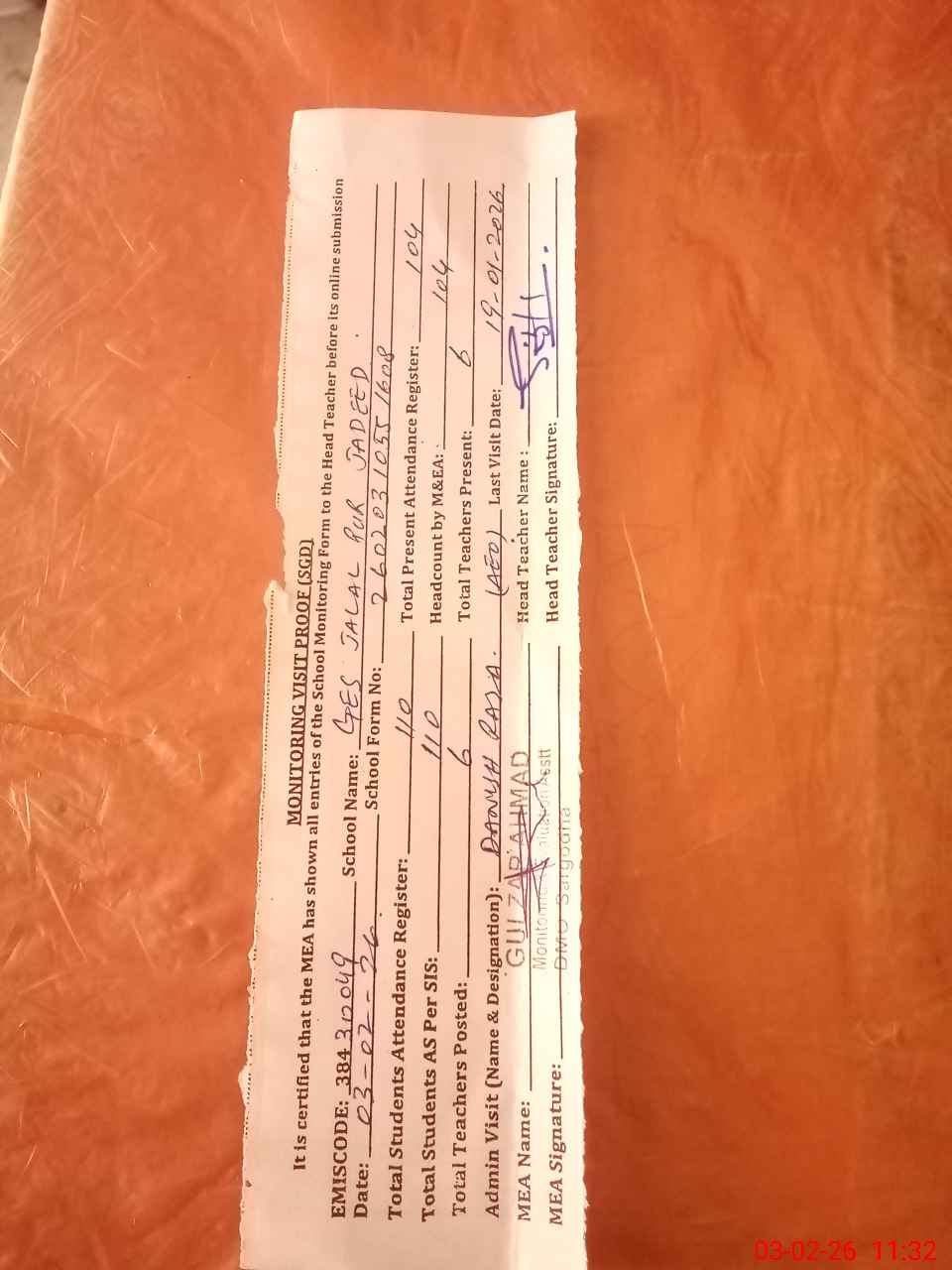 | Attendance Register | Head Teacher | MEA with School | Visit Proof |