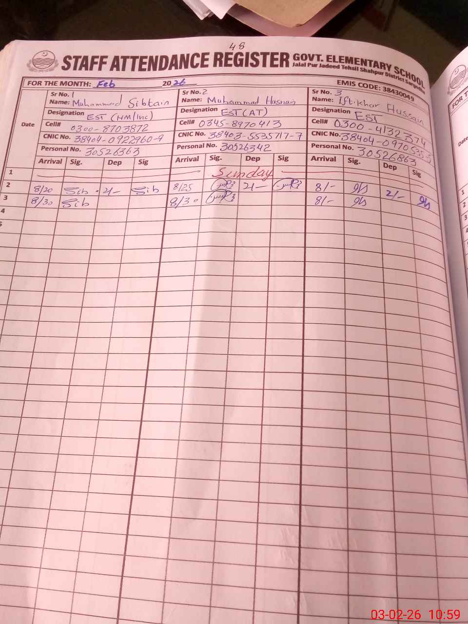 | CNIC | Full Name | Designation | R/C | Absence during last cal. month |