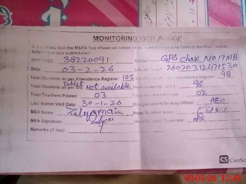 | EMIS Code: 38220091 | Name of School: GPS CHAK NO. 17/MB | |||