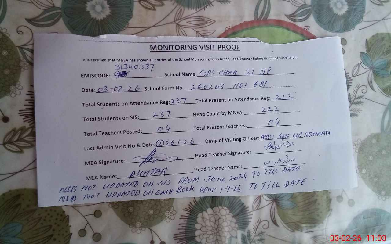 | EMIS Code: 31340337 | Name of School: GPS CHAK NO 21/NP | |||