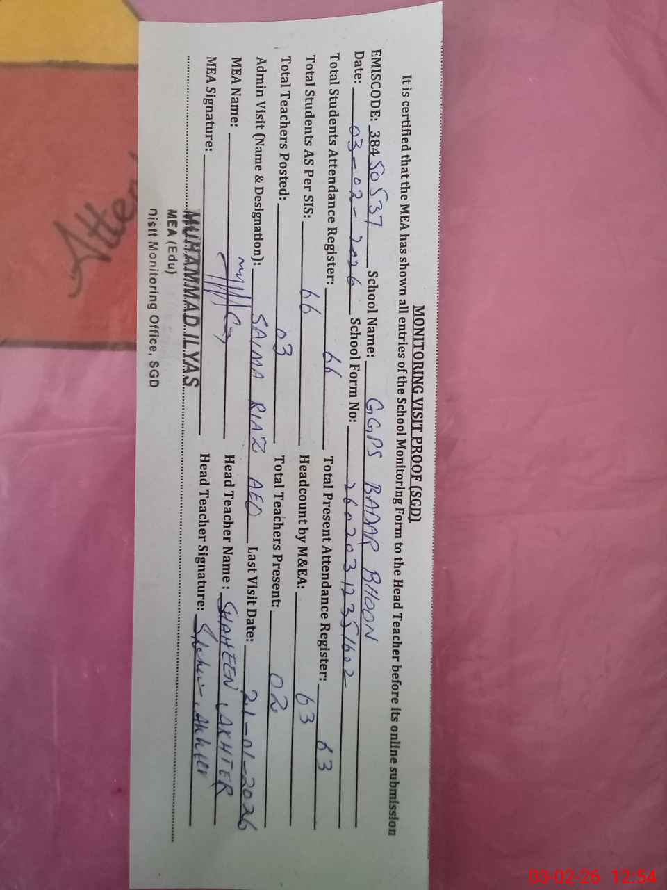 | Attendance Register | Head Teacher | MEA with School | Visit Proof |