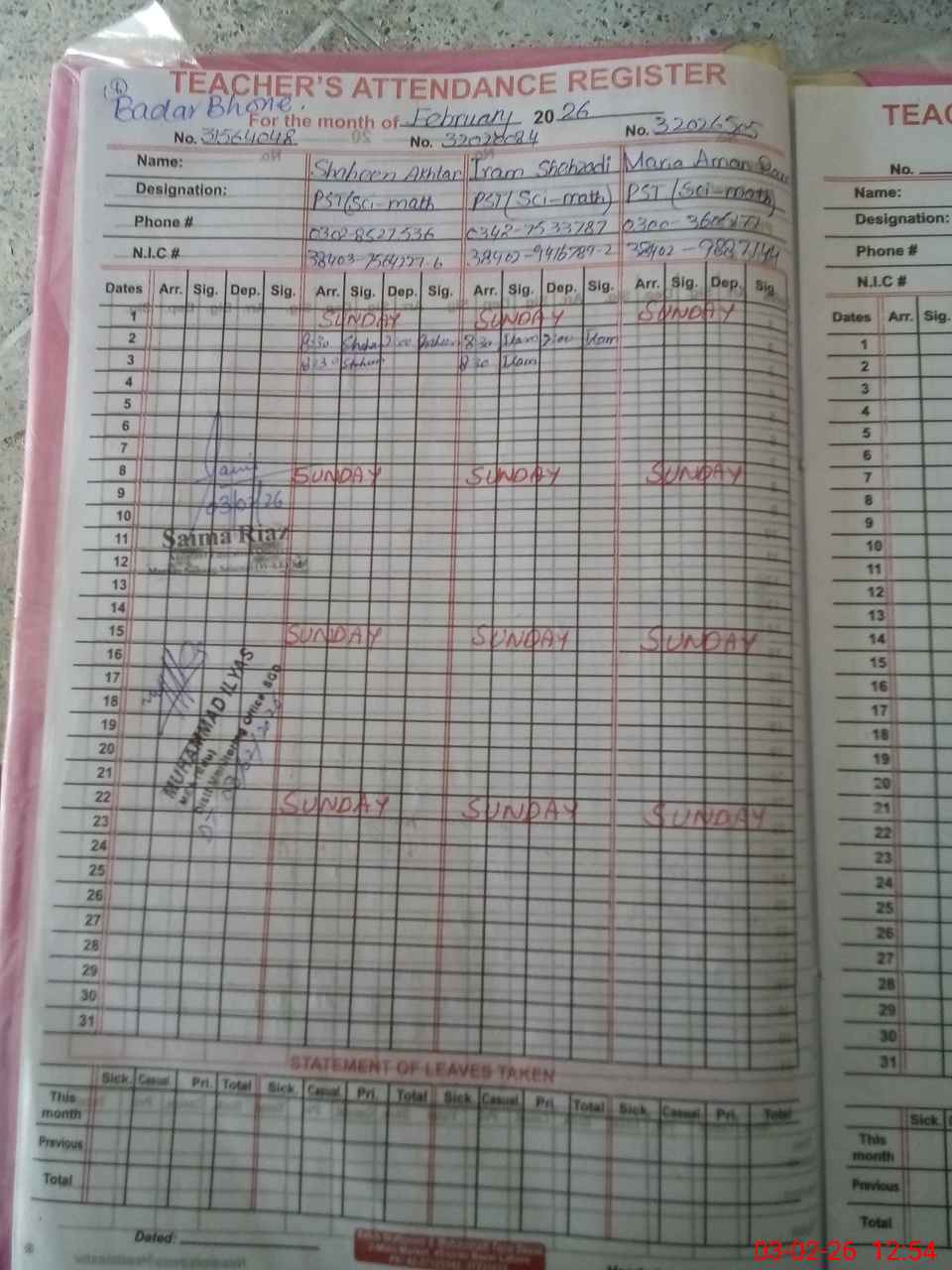 | CNIC | Full Name | Designation | R/C | Absence During Last Calender Month |