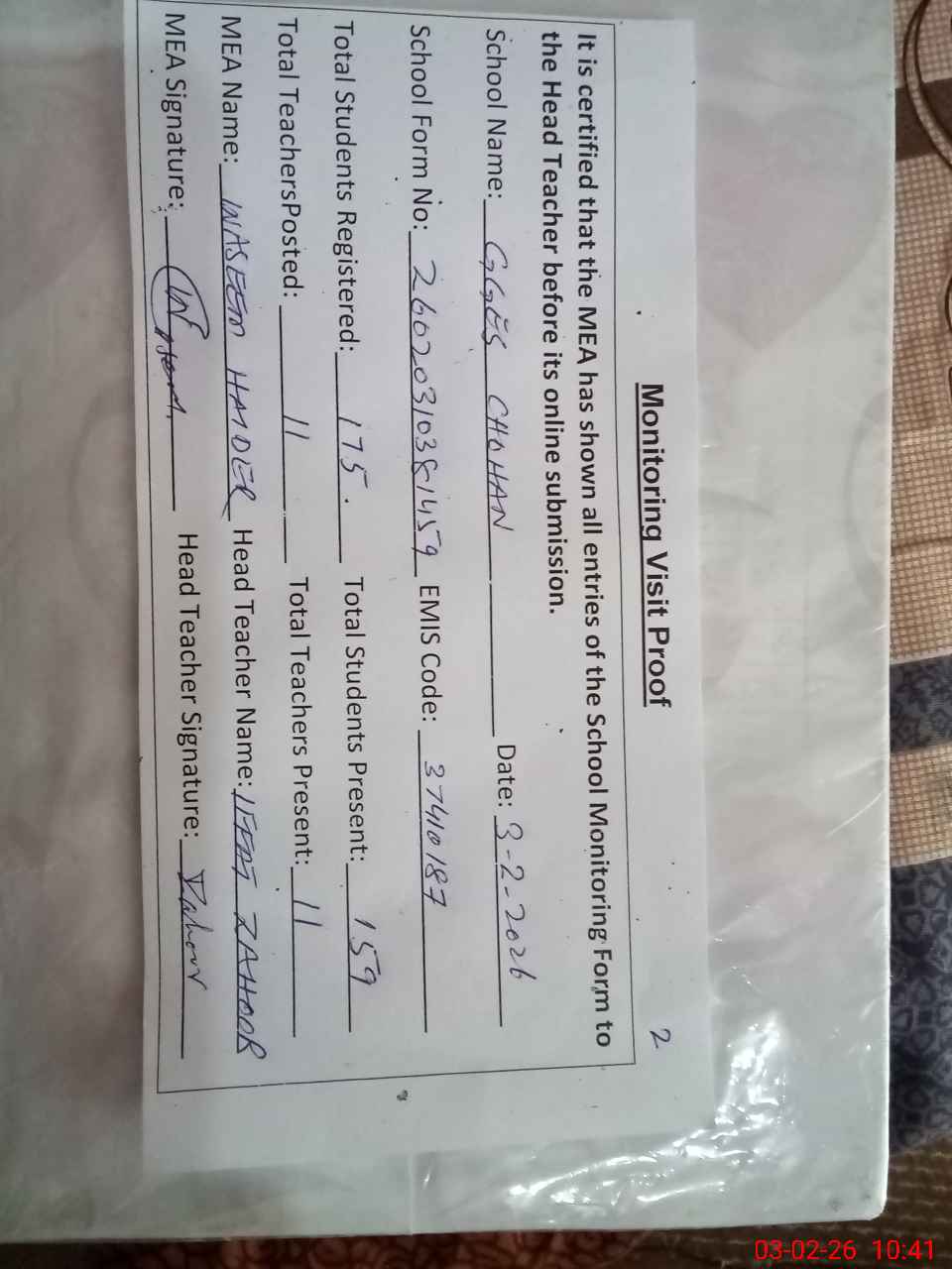 | Certified that this School was Inspected by the Undersigned MEA/DMO Today and the Information Stated Above is as Per Record. | |||||