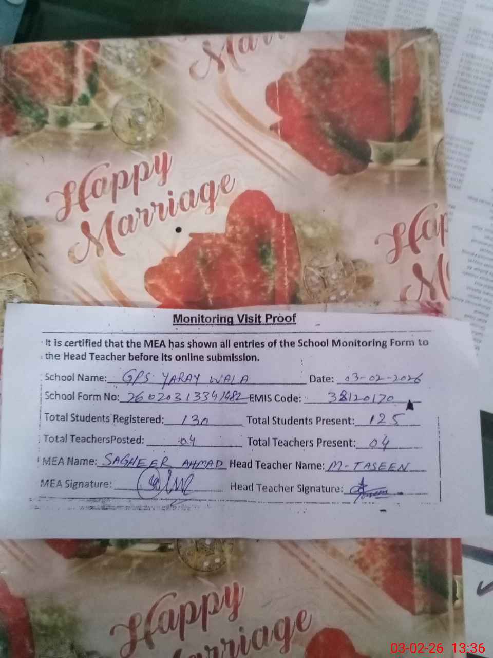 | Attendance Register | Head Teacher | MEA with School | Visit Proof |