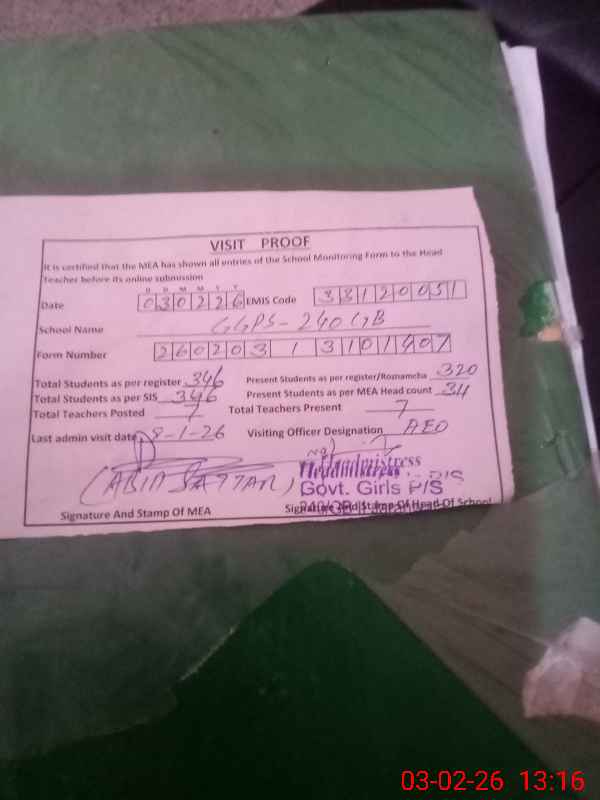 | Certified that this School was Inspected by the Undersigned MEA/DMO Today and the Information Stated Above is as Per Record. | |||||