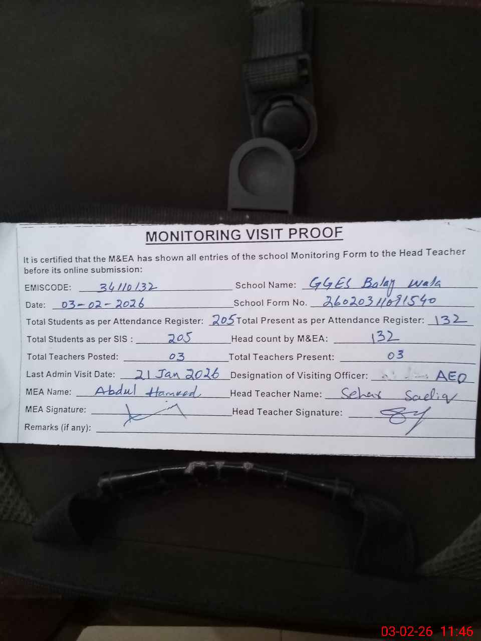 | Attendance Register | Head Teacher | MEA with School | Visit Proof |