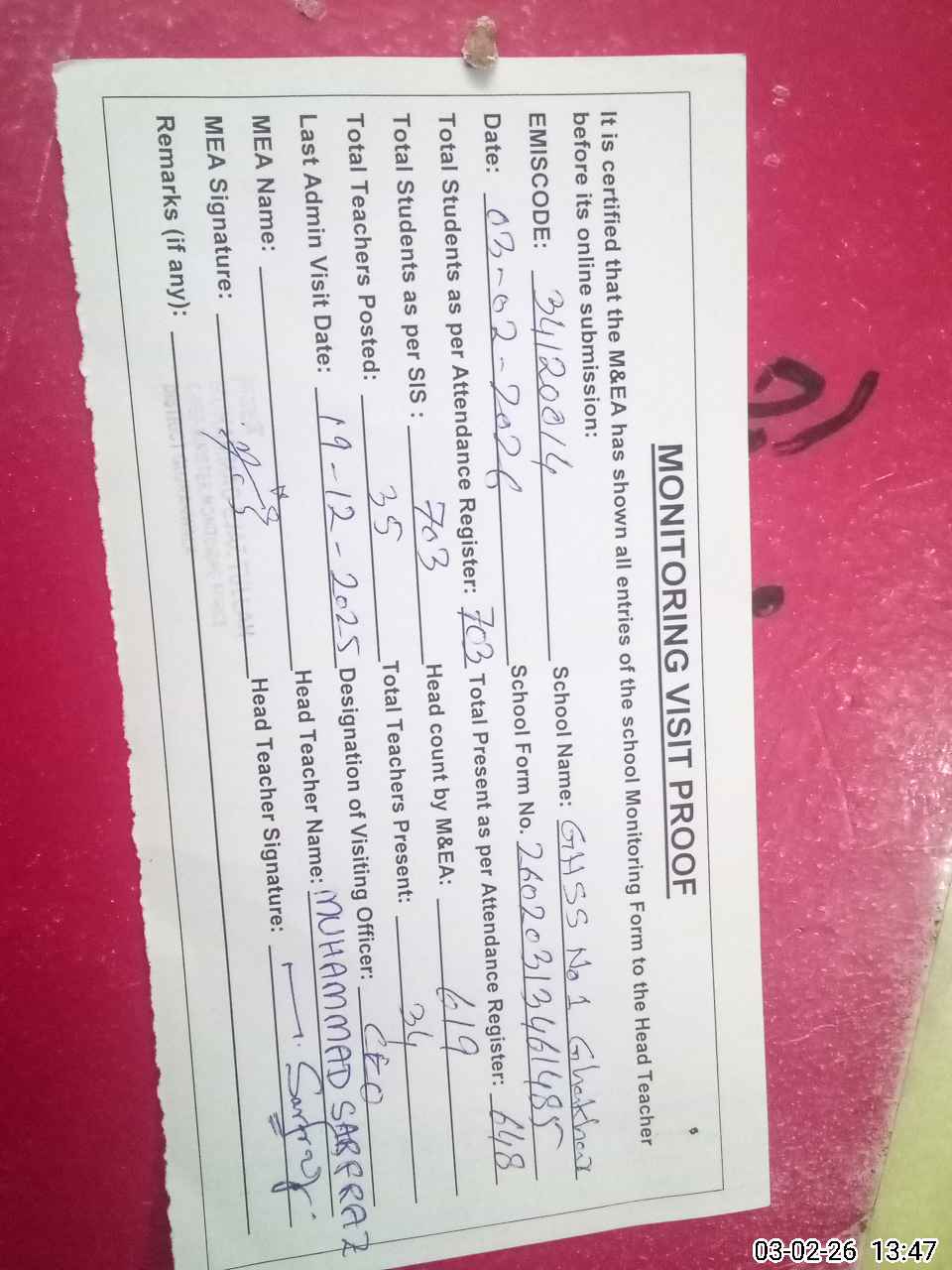 | Attendance Register | Head Teacher | MEA with School | Visit Proof |