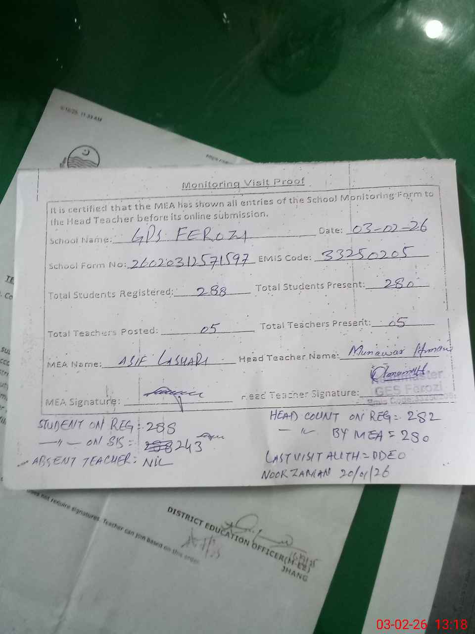 | Attendance Register | Head Teacher | MEA with School | Visit Proof |